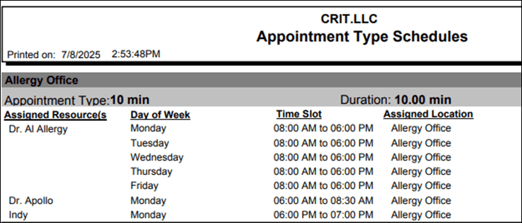 Grouped by Location, Appointment Type and by Assigned Resources. Sorted by Day of the week and Time Slot