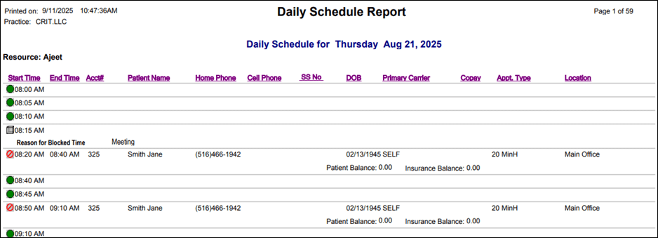Reports >> Billing Reports >> Scheduling Reports >> Daily Schedule Report