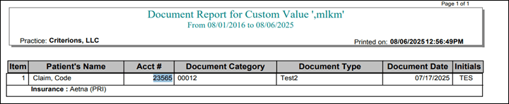 This report shows all documents with the selected custom field value and initials during a selecteddate range.