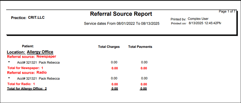 This report shows the charges billed and payments received for patients through different referral sources during a selecteddate range