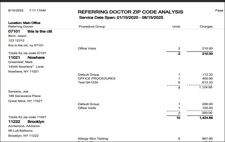 Reports >> Billing Reports >> Referring Doctor Zip Code Analysis