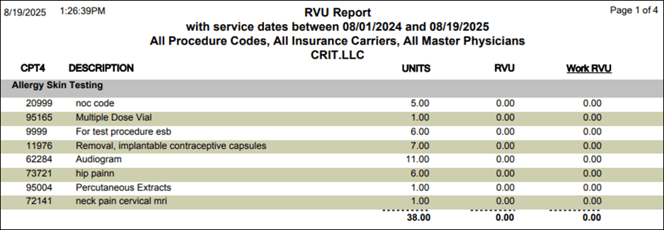 This report shows all RVU details of the procedure codes during a selectedservicedate range